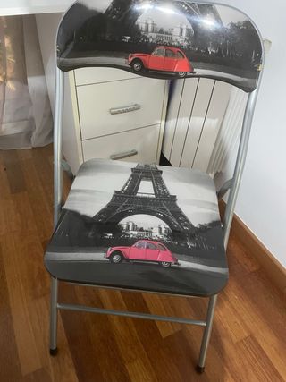 Silla con diseño de la Torre Eiffel y un coche clásico. - Respaldo con imagen de la Torre Eiffel y coche rojo. - Asiento con imagen de la Torre Eiffel y coche rosa. NO ENVIOS HAY QUE VENIR A BUSCARLO