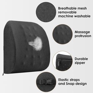 Cojín ergonómico diseñado para brindar soporte lumbar. - Textura de malla transpirable. - Forma contorneada para adaptarse a la espalda. - Ideal para sillas de oficina o coche.