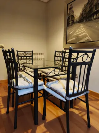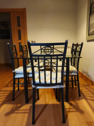 Mesa de comedor con tablero de cristal y estructura metálica en color negro, elegante y resistente. ✔ Incluye 6 sillas metálicas a juego con siento color beige, con 6 cojines de asiento en tono beis. ✔ El cristal se apoya sobre la estructura, que se puede desmontar en 2 partes, unidas con 4 fijaciones, lo que facilita el transporte. ✔ Diseño moderno y funcional, perfecto para comedor o salón. ✔ En buen muy estado, lista para usar. El cristal está cuidado ya que siempre usamos mantel sobre la mesa. ✔ Medidas: 150 largo, 90 ancho, 75 altura. 📦 Recogida en domicilio, fácil de desmontar para llevar en coche.