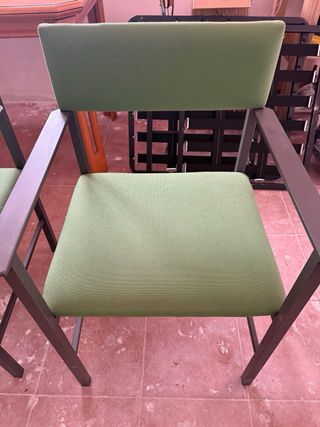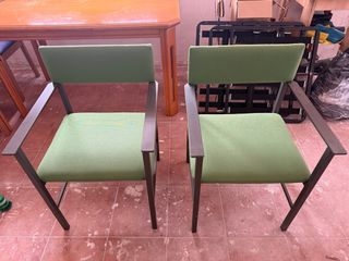 Conjunto de dos sillas de aluminio con un diseño moderno y espacioso. - Asientos y respaldos tapizados en tela verde. - Estructura de metal plateado. - Brazos integrados en la estructura.