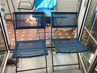 Se venden dos sillas plegables. Son de aluminio y tienen asientos de tela azul. Están en buen estado, aunque muestran ligeras señales de uso. - Plegables para fácil almacenamiento. - Perfectas para balcón o terraza.