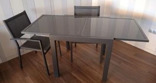 Mesa aluminio y cristal extensible a 160. 2 sillas a juego prácticamente nuevas. Recogida en Estepona