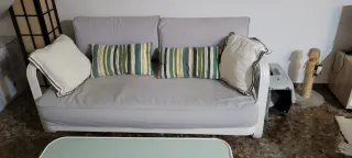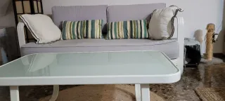 Conjunto de sofá de terraza y mesa. - Tapicería de tela en color gris apta para exterior. - Estructura de aluminio en color blanco. -Mesa en aluminio blanca con cristal templado 38cm de alto, 55 ancho y 100 de largo.
