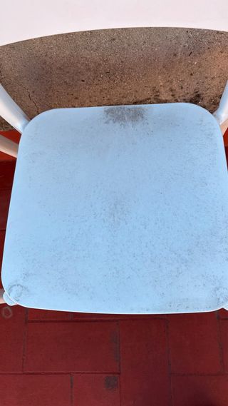 🇸🇪 Conjunto de cuatro sillas de terraza de Ikea, perfectas para tu balcón o jardín. Incluyen cojines blancos para mayor comodidad. - Sillas Tärno con estructura de metal y madera compradas por 15€ cada. - Cojines acolchados Justina comprados por 5€ cada. Un total de 80 euros todo el pack. Las sillas están algo deterioradas pero son perfectamente funcionales.