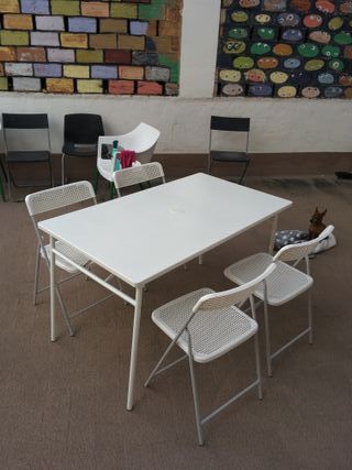 Conjunto de mesa y cuatro sillas plegables de la serie TORPARÖ de Ikea. Ideal para espacios exteriores o interiores. Se han usado solo en un par de ocasiones, y el resto del tiempo han estado guardadas en interior. El precio original eran 206€. - Diseño moderno y funcional. - Estructura metálica resistente. - Acabado en color blanco.