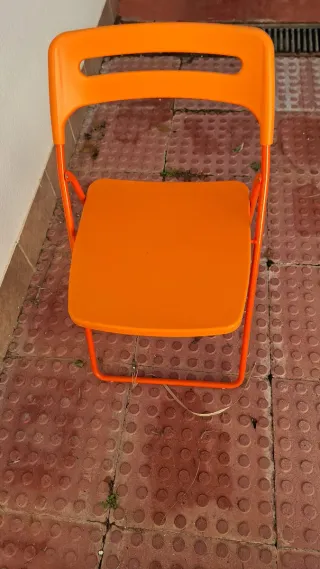 Silla plegable de color naranja, ideal para espacios exteriores o interiores. - Estructura metálica. - Asiento y respaldo de plástico. 8 blancas y 7 naranjas