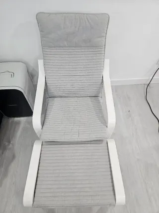 Mecedora de la marca Ikea con un diseño moderno y confortable. Su estructura de madera le da un toque elegante. - Tapicería acolchada en color gris. - Reposacabezas integrado. - Brazos de madera curvada.