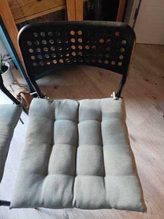 Se venden dos sillas con cojines en perfecto estado, como si fueran nuevas. Son ideales para cualquier espacio. - Estructura de metal. - Cojines de tela.