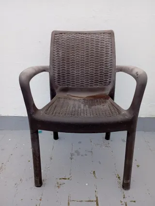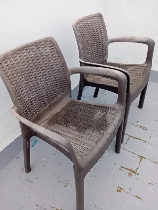 Conjunto de dos sillas de jardín de plástico, resistentes y apilables. - Diseño moderno y funcional. - Asiento ergonómico para mayor comodidad. - Patas estables para todo tipo de superficies. - Han estado fuera hay que limpiarlas