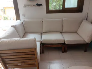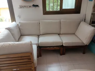 Sofá modular de exterior, perfecto para tu jardín o terraza. Se encuentra en buen estado. - Estructura de madera resistente. - Cojines de color blanco.