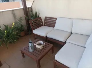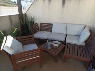 Conjunto de sofá chaise longue para terraza, ideal para disfrutar del aire libre. - Incluye sofá, sillón y mesita de centro. Se pueden vender juntos o por separado. - Estructura de madera. - Cojines de tela en color beige. Dispongo de todos los cojines, en total 5 asientos y 7 respaldos, incluyendo el sillón individual. Las fundas se pueden retirar y lavar en la lavadora. SE ACEPTAN OFERTAS