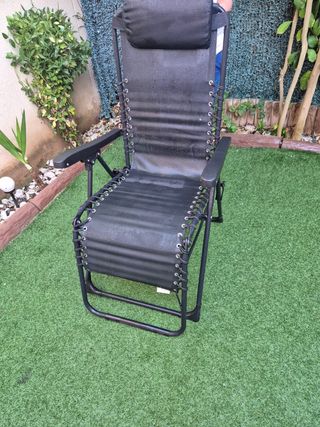 Silla reclinable de jardín, ideal para relajarse al aire libre. Está en buen estado, aunque presenta algunas marcas de uso. - Plegable para facilitar su almacenamiento. - Respaldo regulable. - Cómoda y resistente.
