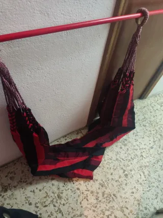 Hamaca colgante con un diseño a rayas rojas y negras. Perfecta para relajarse. Está en perfectas condiciones nunka se ha usado - Tejido resistente y duradero. - Cuerdas trenzadas para un buen soporte.
