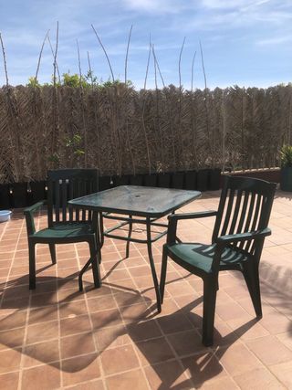 MESA DE JARDIN (uso interior o exterior). En hierro color verde y cristal con agujero para sombrilla. Tiene muy poco uso y va acompañada con 2 sillas (de muy buena calidad y fuertes) tal y como se ve en la foto. Aparte de este conjunto, tengo 2 juegos mas (cada uno con sus 2 sillas) .... Hay 6 sillas mas, que se pueden vender aparte y cada juego puede llegar a tener 4 sillas cada uno pero el precio varia.