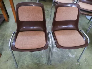 Conjunto de sillas apilables con un diseño moderno. - Estructura principal de metal. - Asiento y respaldo de plástico. - Combinación de colores dorado y blanco. Todas juntas 30€