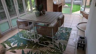 Conjunto de mesa de 110 y cuatro sillas de exterior, perfecto para disfrutar de momentos al aire libre. Se incluye también la alfombra. Comprado en Masion Du Monde hace dos años por casi 700€. Practicamente ni se ha usado, se vende por cambio de vivienda. Se recoge en Más Camarena.