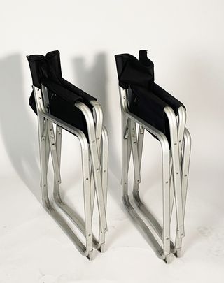 Conjunto de dos sillas plegables de estilo director, perfectas para cine o eventos, regalo una 3ª que hay que coser 10cm lateral - Estructura de aluminio. - Asiento y respaldo de tela negra.