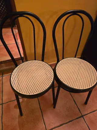 Conjunto de 30 sillas de estilo parisino, perfectas para hostelería o eventos. Son de rattan , mimbre - Diseño elegante con estructura metálica. - Asiento y respaldo de mimbre tejido. - Combinación de colores marrón y multicolor. Se venden a 35€/unidad
