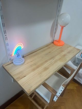 Conjunto de estanterías y escritorio fabricado en madera de pino. Ideal para organizar y decorar espacios. Incluye estructura metal blanca y soportes de metal blanco. Ideal para habitaciones infantiles para ir cambiando de altura segun etapa. Ancho de 80cm. (La silla menorquin pequeña y plegable tambien la tengo en mi perfil en venta)