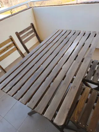 Conjunto de mesa y cuatro sillas plegables de exterior. Ideal para disfrutar del buen tiempo en tu terraza o balcón. - Mesa de listones de madera. - Sillas plegables a juego. Largo: 112cm Ancho: 61cm *Algo desgastadas por el sol, pero nada que un buen barniz no solucione :) *Nuevas valdrían 185€