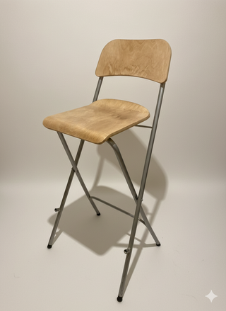 Taburete alto con un diseño moderno y funcional. Es fácil de plegar y guardar. - Asiento y respaldo con acabado en madera. - Estructura de metal resistente.