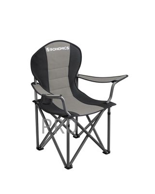 SONGMICS Silla plegable de camping, con cómodo asiento de esponja, soporte para tazas, estructura resistente, capacidad de carga máxima de 250 kg, silla de picnic al aire libre, gris y negro GCB006G01