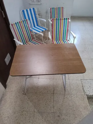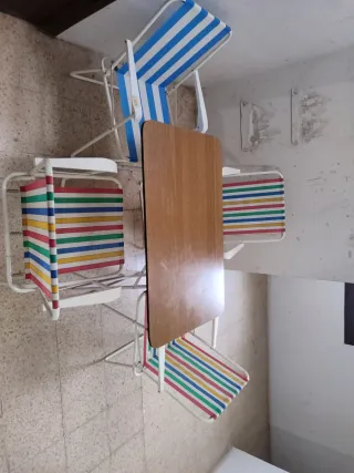 ** se vende por mudanza a península** Mítica mesa camping + 4 taburetes Asa superior para su transporte. Impecable Mesa desplegada Altura 69cm Ancho 60cm Largo 120cm Mesa plegada Alto 60cm Ancho 10 Largo 60cm
