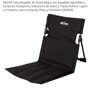 Silla plegable de suelo en color negro, con respaldo ajustable y funda de transporte. - Estructura de acero. - Tejido Oxford. - Ligera y compacta. - Ideal para camping, playa y exteriores.