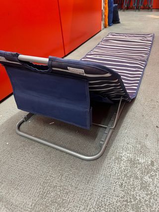 Hamacas plegables de Decathlon, ideales para llevar a la playa o de camping. Son cómodas y fáciles de transportar. - Estructura metálica. - Respaldo ajustable - Tejido de tela acolchada, una con rayas azules y blancas, una azul y otra de color naranja. Precio por unidad: 6 euros. Las 3, por 15 euros. Se entregan en mano en Poblenou