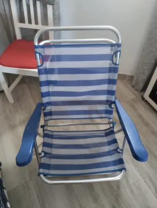 Sillón plegable perfecto para llevar a la playa o de camping. Su diseño a rayas azules y blancas le da un toque veraniego. - Estructura de metal. - No hago envíos - Asiento y respaldo de tela.
