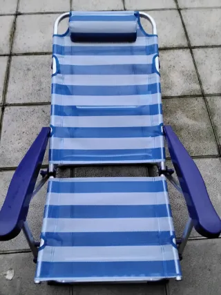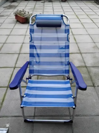 Silla para terrazas, jardin, playa, etc, plegable, color azul , blanco rayas, reposabrazos, reclinable varias posiciones. Medidas: Altura del suelo al respaldo 106 cm. Respaldo: 70 cm. Asiento 46 cm. Precio 23 euros.