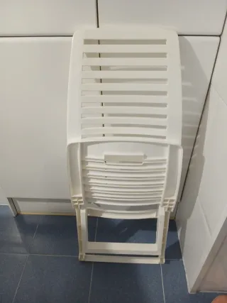 Silla plegable de plástico, ideal para llevar a la playa o usar en exteriores. Su diseño ligero la hace fácil de transportar. - Color blanco. - Material de plástico resistente.