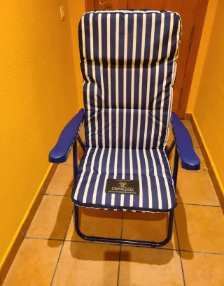 Silla de playa plegable, perfecta para llevar contigo a la arena o al campo. Su diseño la hace muy práctica. - Estructura de metal y plástico. - Asiento y respaldo de tela a rayas. Tiene dos posiciones esta en buen estado tiene un poco de óxido en unos laterales pero hace su función perfectamente