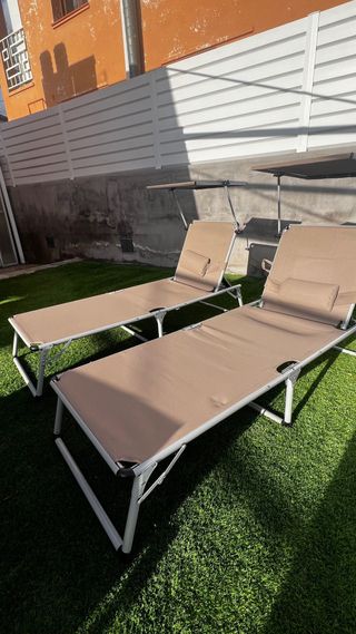 Pack de dos tumbonas plegables, perfectas para llevar a la playa o de camping. Son ligeras y fáciles de transportar, cada una tiene su propia bolsita con asas. Ocupan poco. Usadas una única vez el verano pasado. Las vendo por mudanza. - Estructura metálica. - Tejido de poliéster