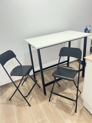 Conjunto de mesa alta tipo barra y dos taburetes plegables. - Mesa con sobre blanco y patas negras. - Taburetes negros plegables.
