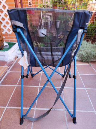 Silla plegable ideal para acampar o disfrutar al aire libre. Se encuentra en buen estado. - Cómoda y ligera. - Reposavasos incorporado. - Estructura metálica resistente.