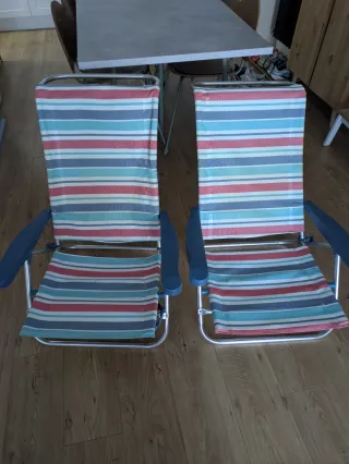 Tengo 2 sillas plegables. Fácil de transportar con la bolsa. Pesan 3 kg cada una. Usadas 1 vez. Mide 90 cm de altura. 20 euros cada una. Las 2 por 30.