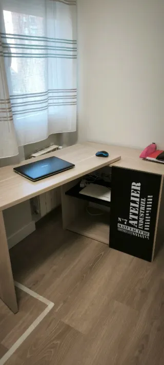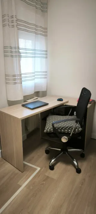 Conjunto de escritorio con ala plegable y silla de oficina. - Escritorio de color beige. - Silla de color negro. - Materiales: madera y plástico.
