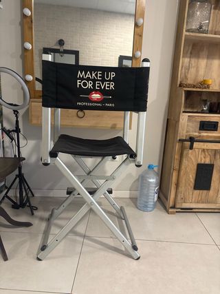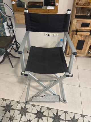Silla de director plegable, ideal para maquillaje o como asiento auxiliar. - Estructura de aluminio plateado. - Asiento y respaldo de tela negra. - Reposapiés metálico.