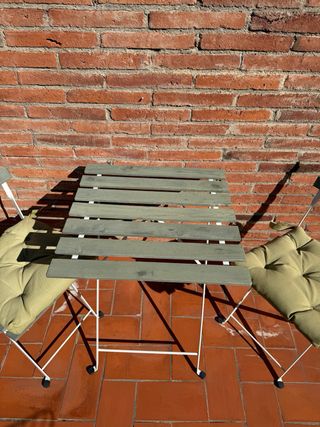Conjunto de mesa y sillas de exterior de IKEA, ideal para tu terraza o jardín. Se encuentran en muy buen estado. - Estructura de metal resistente. - Tablero de madera. - Diseño plegable para fácil almacenamiento. Mesa y sillas de exterior IKEA en muy buen estado. Estructura de hierro y lamas de madera, resistentes y pensadas para terraza o balcón. Conjunto plegable y fácil de guardar. No dispongo de medidas exactas, podéis encontrar el modelo buscando en IKEA. Precio conjunto mesa + sillas: 40 € (negociable). No se envía. Recogida en El Clot. Contesto mensajes a partir de las 15:00.