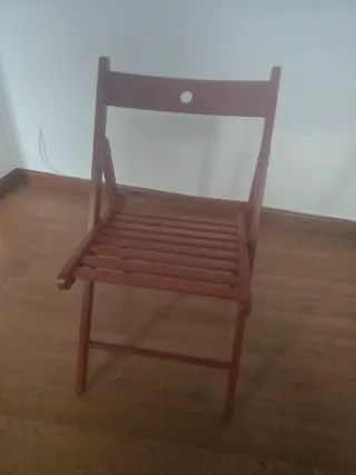 Silla plegable de madera maciza de IKEA, muy resistente y funcional. Diseño clásico con asiento de lamas y respaldo con orificio central que facilita su transporte y colgado. ✔️ Plegable, ocupa muy poco espacio ✔️ Robusta y estable ✔️ Ideal como silla auxiliar, cocina, terraza cubierta o escritorio ✔️ Madera barnizada en tono rojizo/marrón ✔️ En buen estado general, uso normal Perfecta para tener como silla extra o para espacios pequeños.