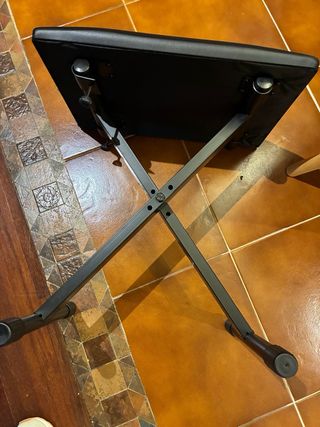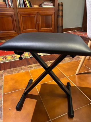 Taburete acolchado con estructura plegable. - Asiento cómodo. - Patas antideslizantes.