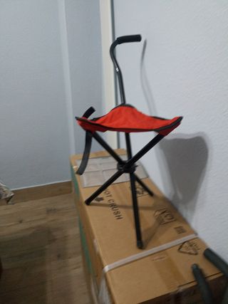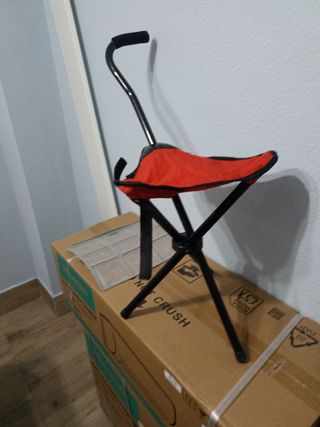 Vendo silla bastón plegable, ideal para conciertos o eventos. Es ligera y fácil de transportar. - Perfecta para descansar en eventos. - Estructura de metal. - Asiento de tela roja.