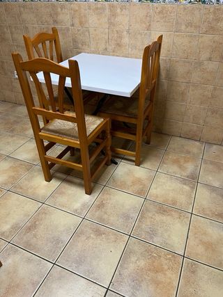 Conjunto de mesa y cuatro sillas de madera. Ideales para comedor o cocina. - Mesa cuadrada con tablero blanco. - Sillas con asientos de mimbre. - Estructura de madera robusta y en buen estado. - Perfecto para espacios pequeños.
