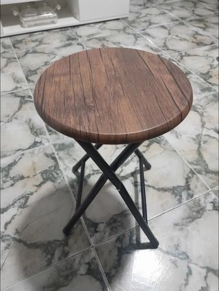 Taburete plegable de madera y metal, ideal para cualquier espacio. Se encuentra nuevo a estrenar - Diseño compacto y fácil de guardar. - Perfecto como asiento auxiliar. - Medidas: 30 cm de diámetro y 46 cm de alto.
