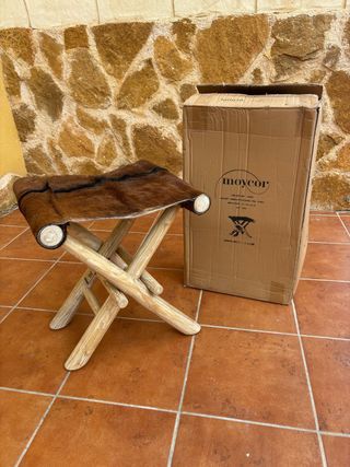 Se venden dos taburetes plegables. Son de madera y tienen un asiento de piel. Están en muy buen estado. - Asientos de piel con dibujos grabados. - Estructura de madera resistente. - Diseño plegable para fácil almacenamiento.