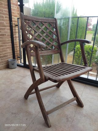 Sillas de teca para exterior, perfecta para tu terraza o jardín. Su diseño plegable la hace muy práctica. - Fabricada en madera de teca. - Diseño clásico con respaldo de enrejado. - Brazos curvos para mayor comodidad. - 20 euros por unidad.