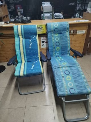 Dos sillas plegables, ideales para disfrutar del buen tiempo. Una es una tumbona y la otra una silla. En muy buen estado. Compradas en el Corte Ingles. - Diseño azul con estampado. - Estructura metálica. - Cojines acolchados. - Precio por las dos juntas. - Venta en mano en Esplugues de Llobregat.