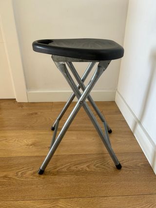 Taburete plegable con asiento negro y estructura metálica. Diseño compacto para fácil almacenamiento. 10€ cada uno