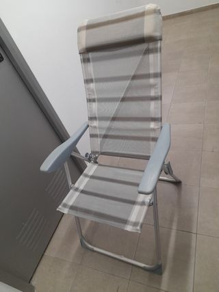 Tumbona plegable con estructura de aluminio y asiento de tela tipo plastico. Comprada en el corte inglés. - Diseño moderno y funcional. - Fácil de transportar y almacenar con asa y ligera.